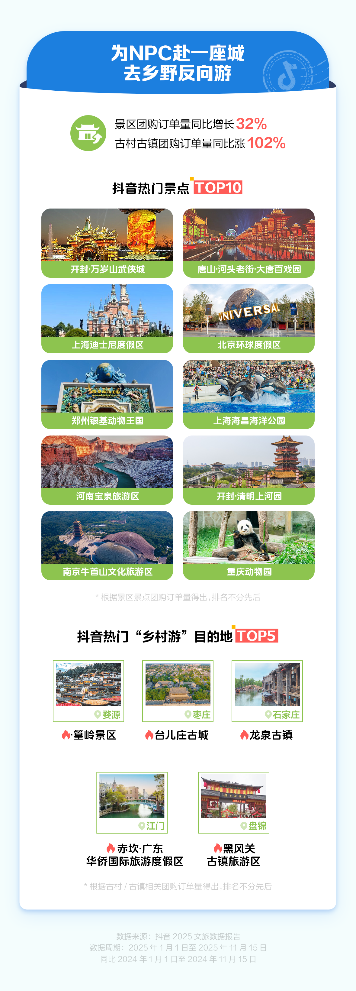 从订单消费看,上海、北京、成都、郑州、杭州等入围十大热门旅游城市。洛阳、湖州、秦皇岛、开封、徐州等入围十大热门宝藏城市。抖音景区团购订单量同比增长32%。“NPC游”、“IP游”持续出圈,万岁山武侠城、河头老街·大唐百戏园、上海迪士尼度假区、北京环球度假区、郑州银基动物王国、上海海昌海洋公园、河南宝泉旅游区、清明上河园、南京牛首山文化旅游区、重庆动物园成为十大热门景点。